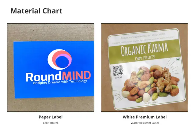 - White/ Clear Premium Labels: Waterproof; Chrome Art Paper, Kraft Labels: Non-waterproof, Gold Paper and Silver Paper.